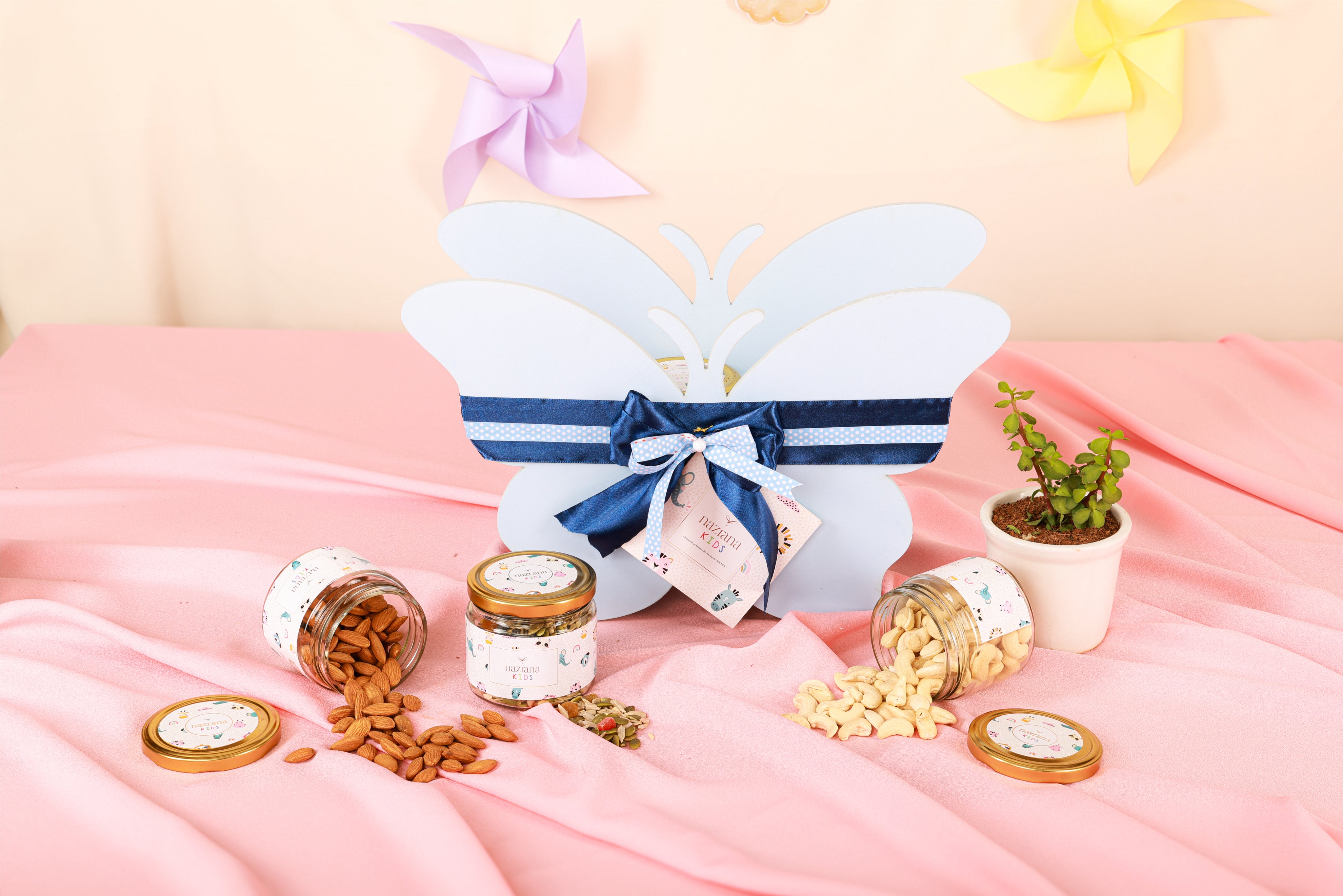 Presented in an elegant butterfly-shaped box, this hamper features premium dry fruits in charming jars, symbolising health, sweetness, and abundance. Soft pastel hues, delicate ribbons, and a touch of greenery make it a timeless baby shower gift that speaks from the heart. Perfect for baby showers, naming ceremonies, or maternity celebrations.