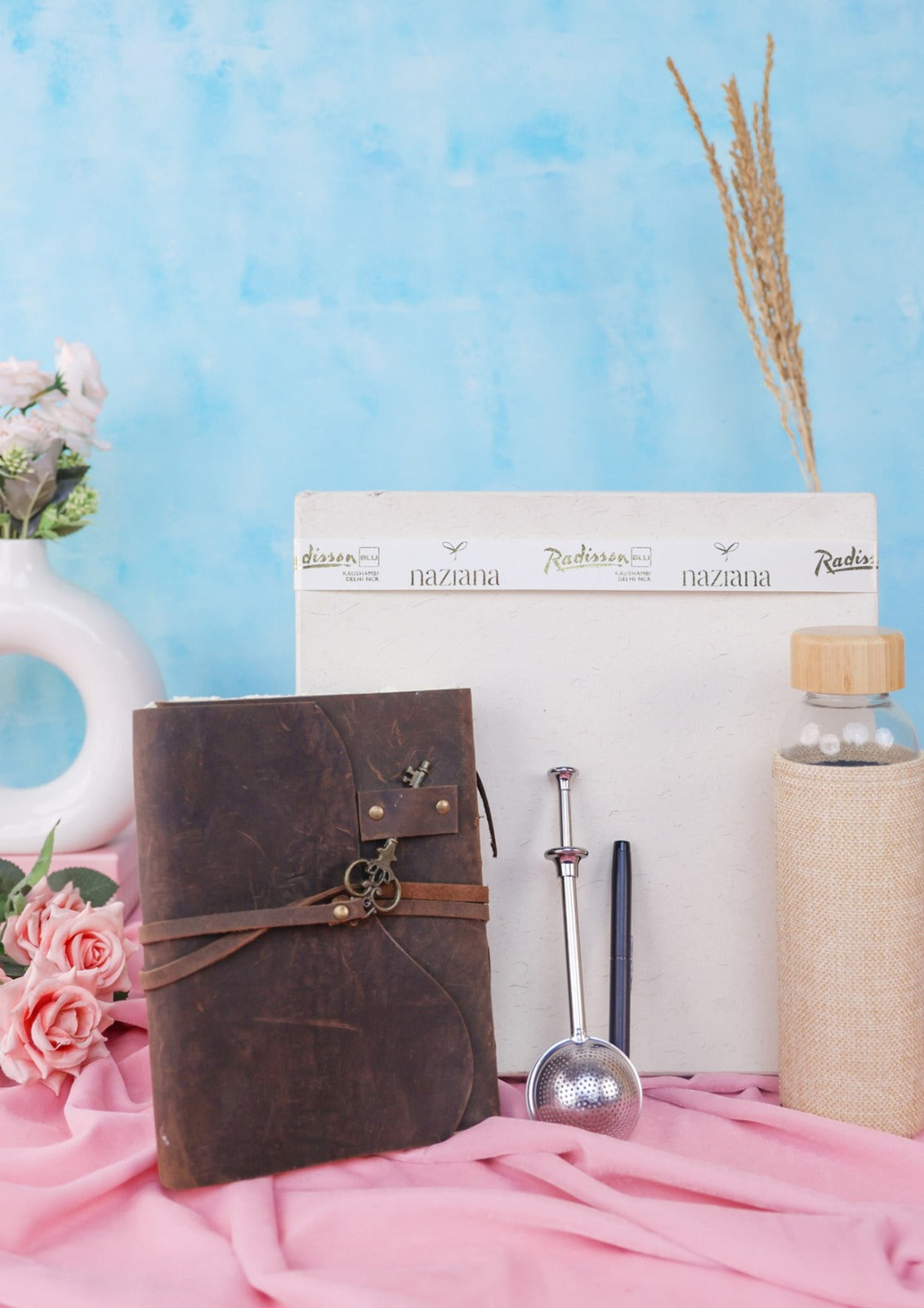 A refined and elegant hamper curated for modern professionals. The White Luxe Box includes a premium diary, a smooth-writing executive pen, a sleek hydration bottle, aromatic tea and a fine tea strainer. Perfectly packed in a crisp white box that reflects purity, sophistication, and corporate elegance.