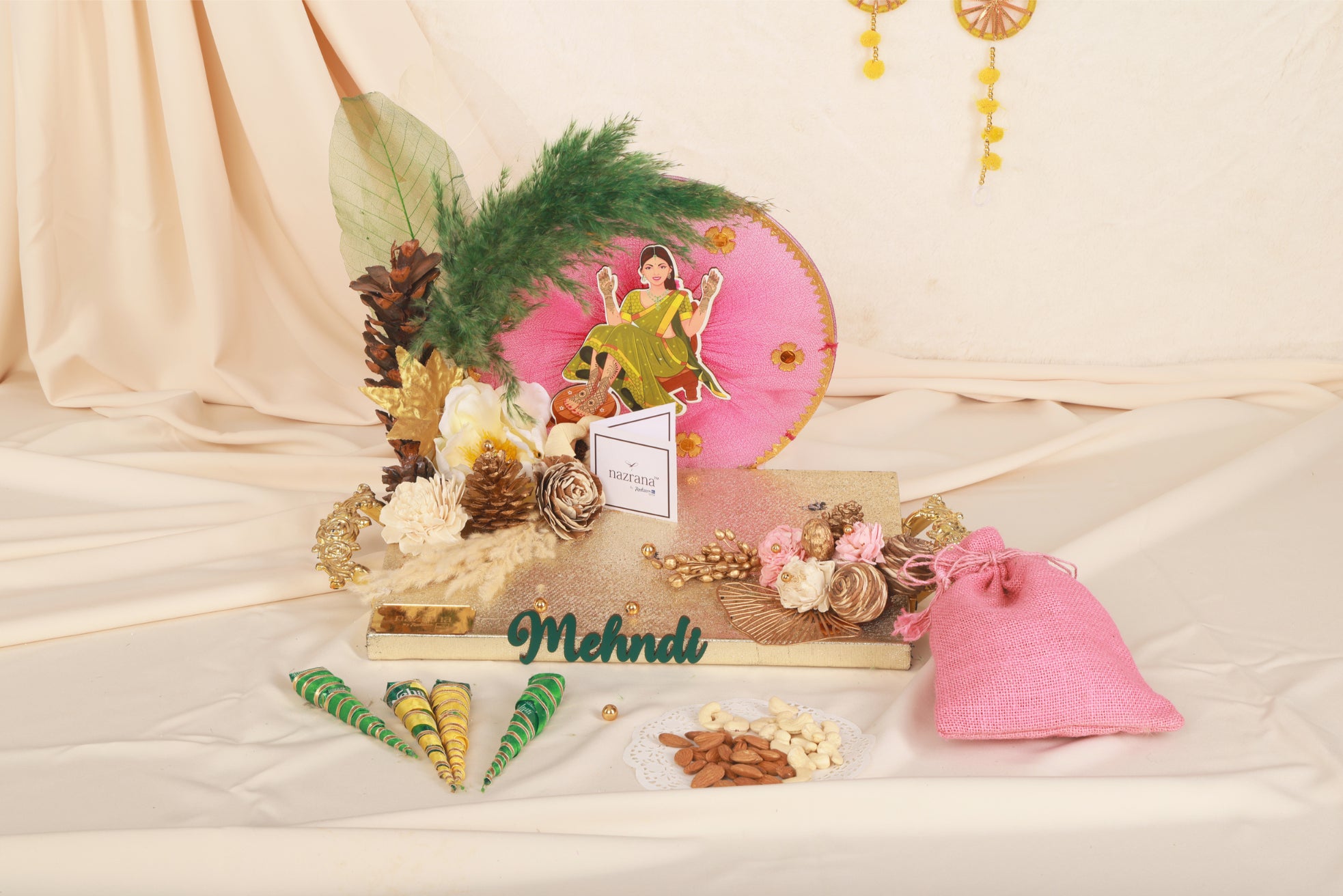 Perfectly curated for pre-wedding celebrations, it includes rich mehndi cones, a fragrant potli, premium nuts, and decorative elements that make the moment even more special.