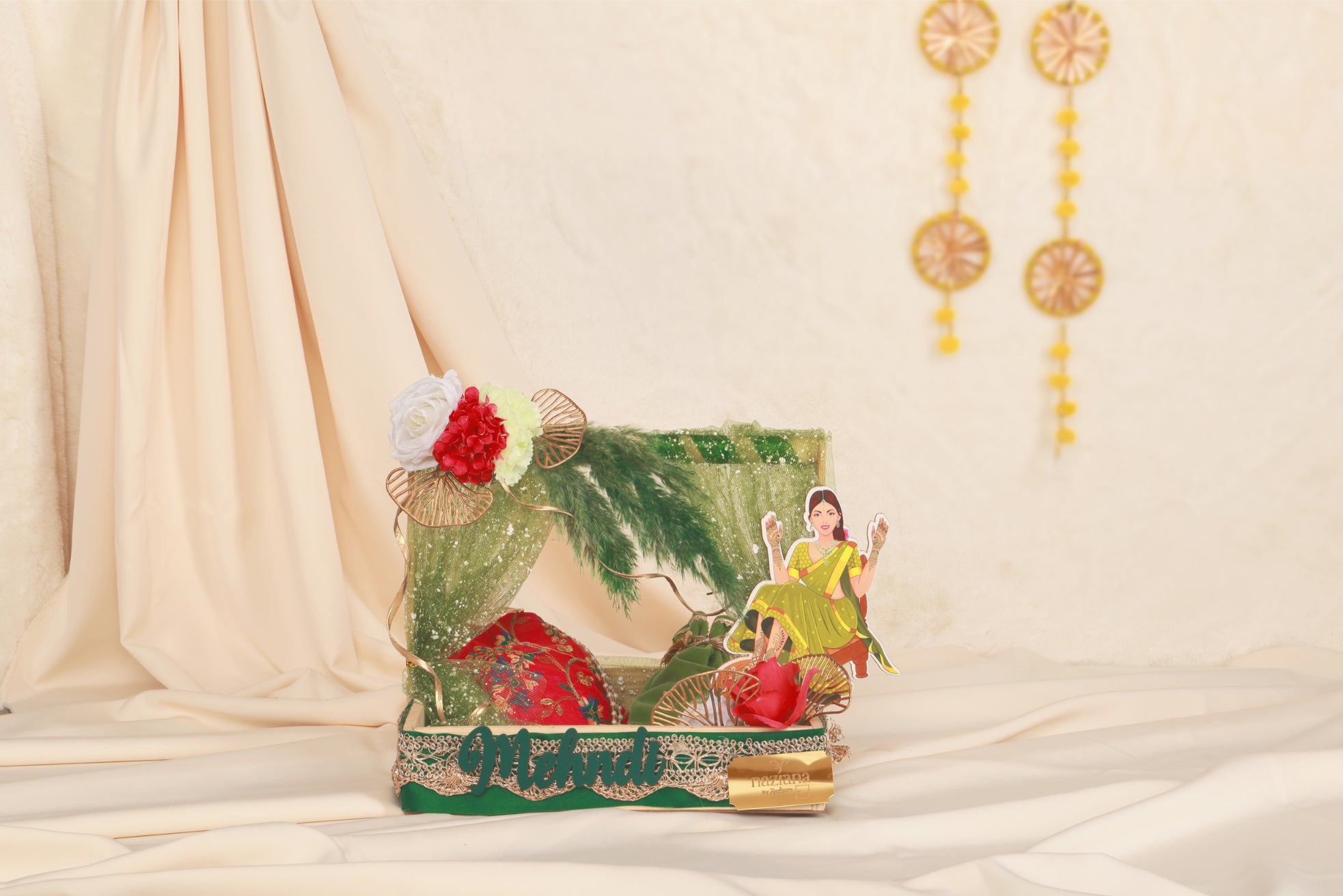 Inspired by the beauty of festive rituals, this elegant Mehndi hamper comes adorned with a dreamy green canopy, handcrafted elements, and radiant floral detailing. It includes designer mehndi cones, vibrant bangles, dry fruits, and a traditional potli—making it a perfect blend of elegance, culture, and festive joy. Ideal for bridesmaids, mehndi giveaways, or personalised gifting.