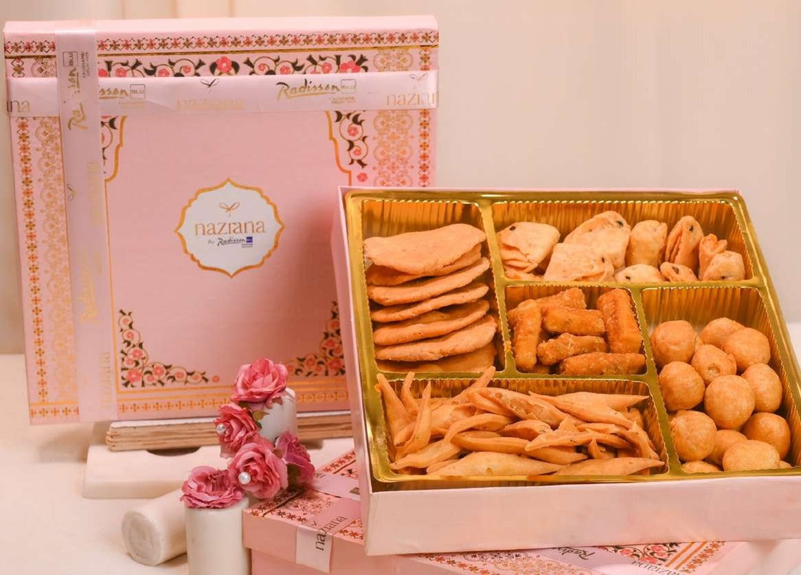 A vibrant assortment of flavorful savory treats, packed in a stylish box designed to add zest and joy to sacred rituals and grand celebrations alike.