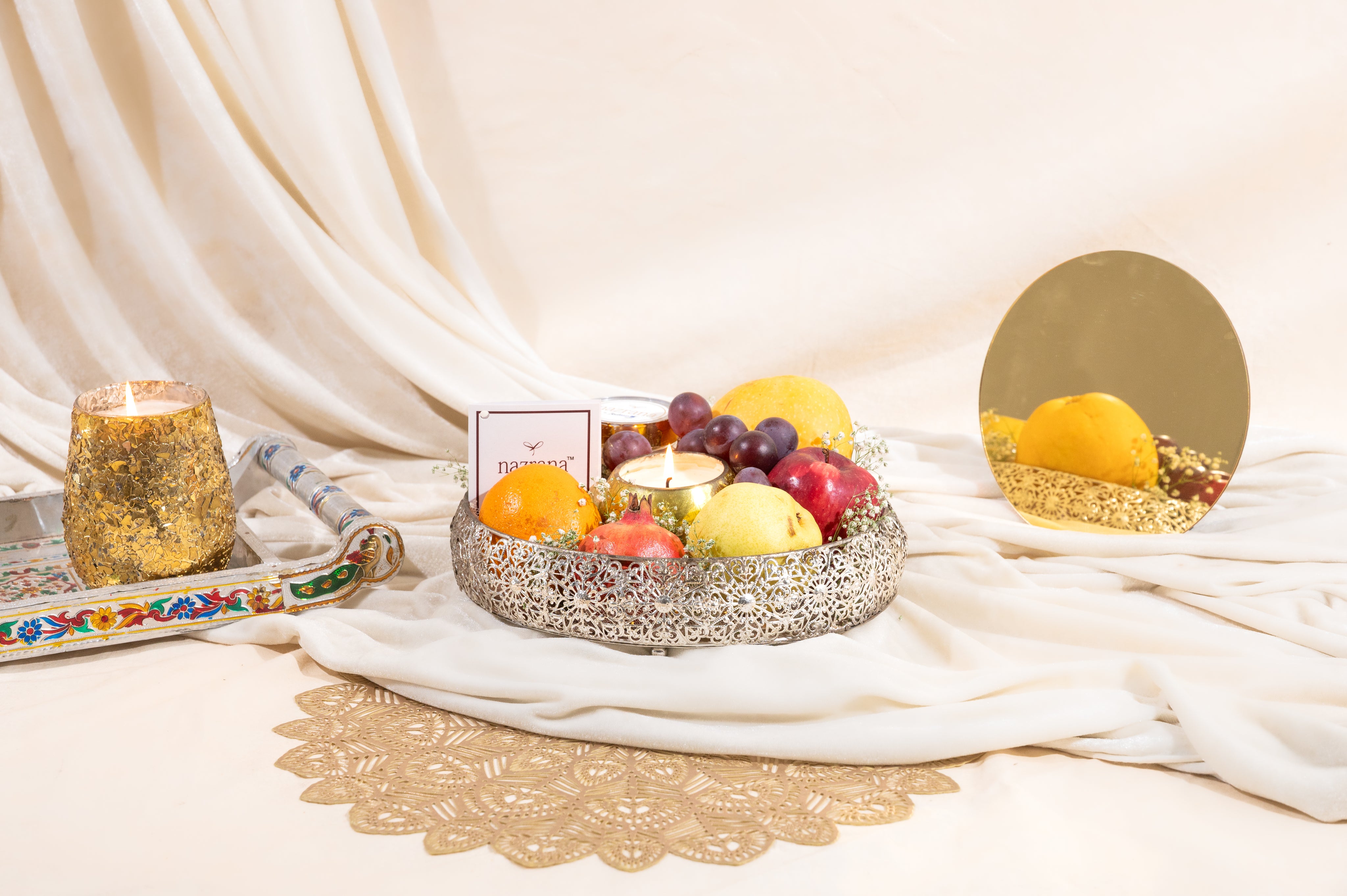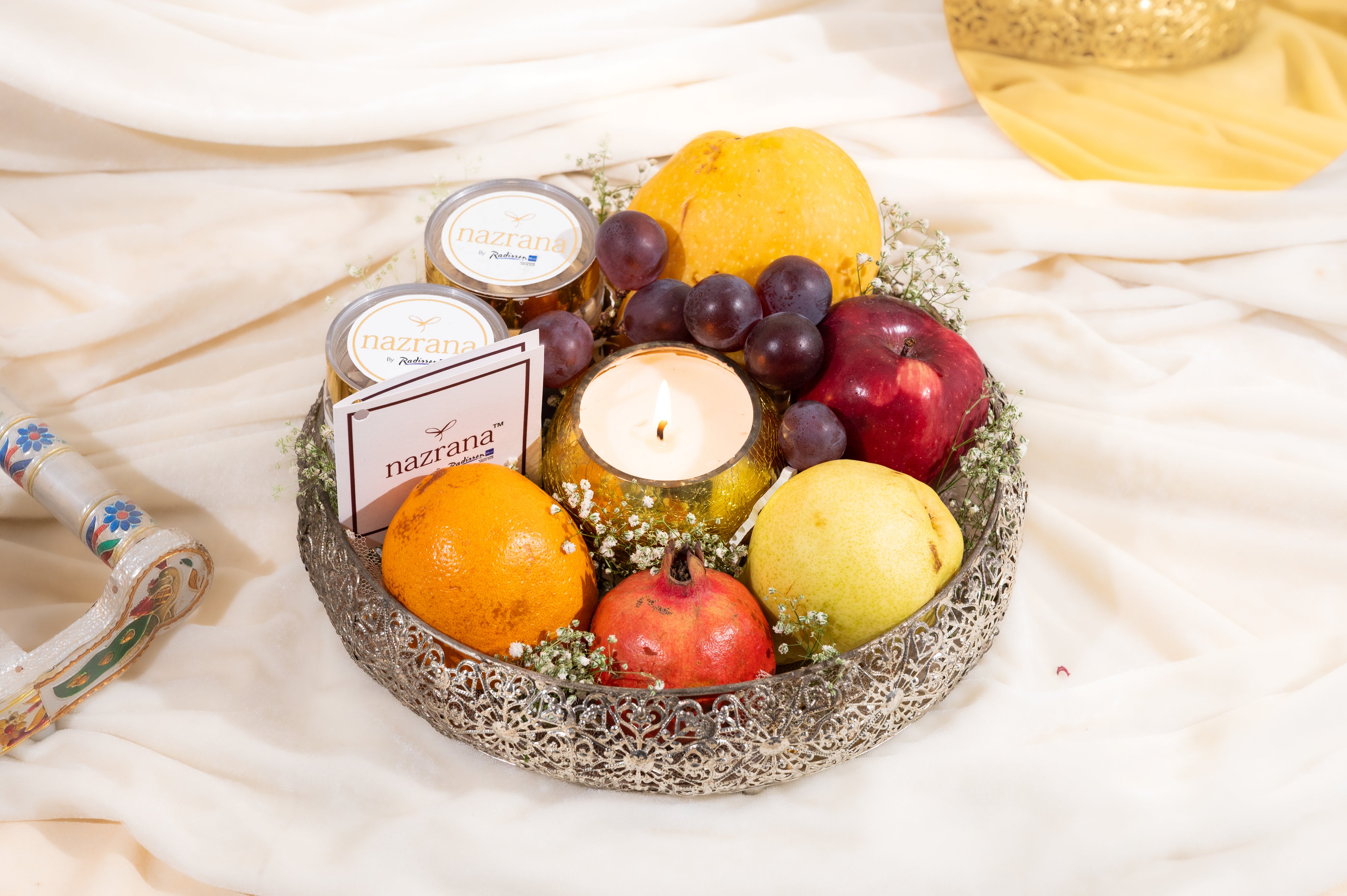 Mark the beginning of something beautiful with the ‘Aarambh Thal’—a thoughtful Sagan hamper containing seasonal fruits, dry fruits, and a diya in a shimmering silver thal, blessing the moment with prosperity and joy.