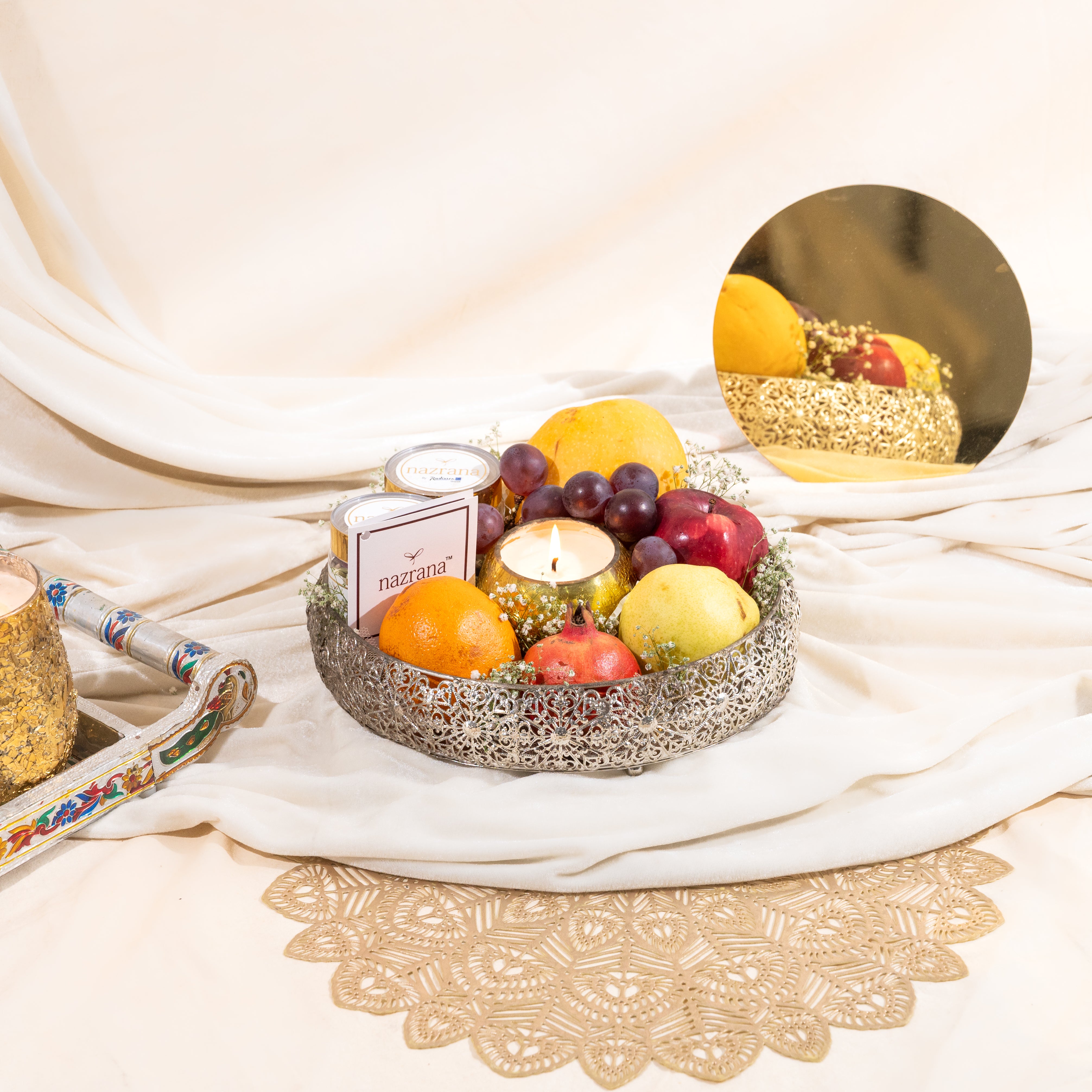 More than 1 kg Seasonal Fruit German Silver Tray with one jar Palm Date and one jar Raisins with Golden Delightful Round Candle