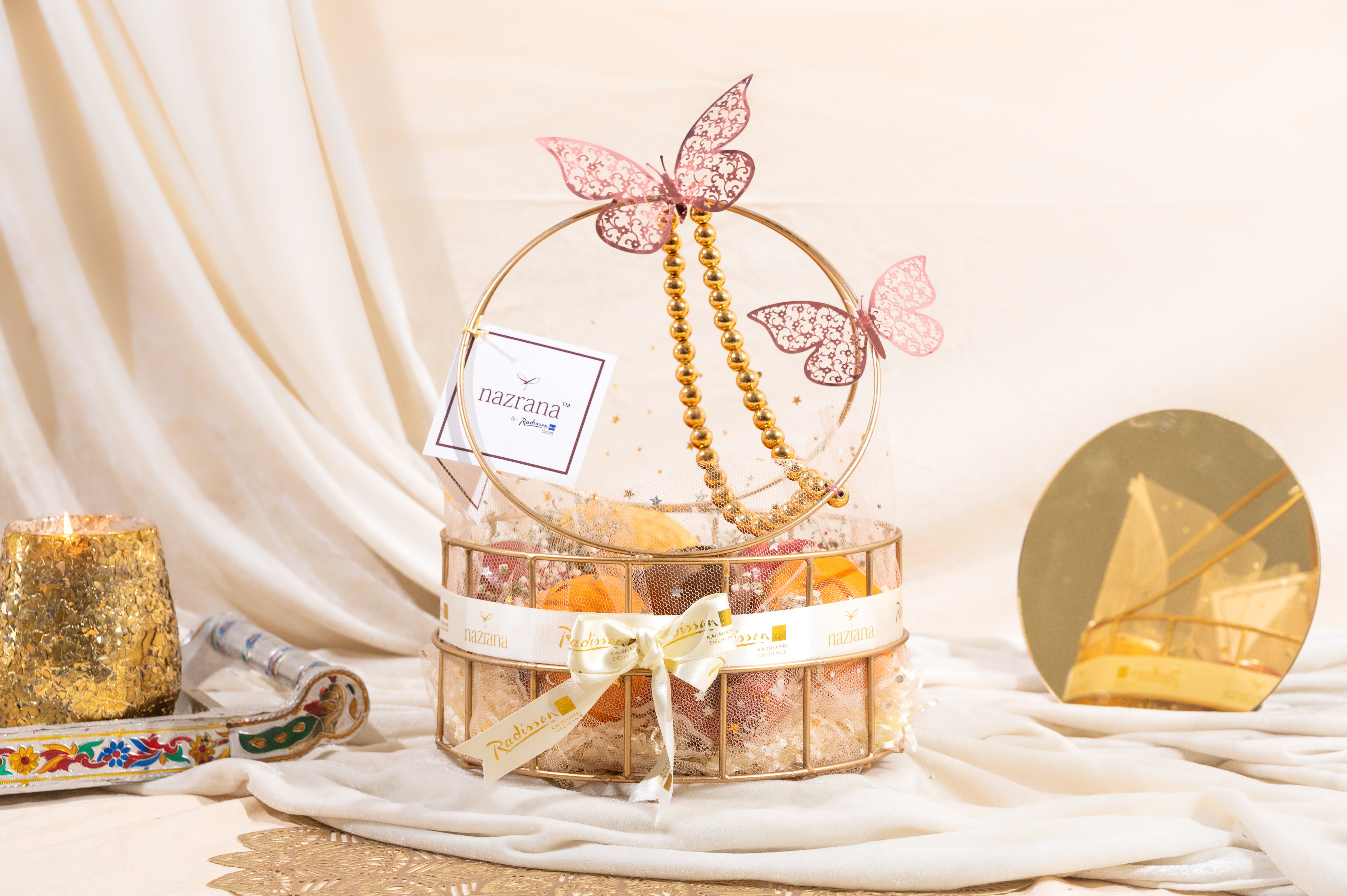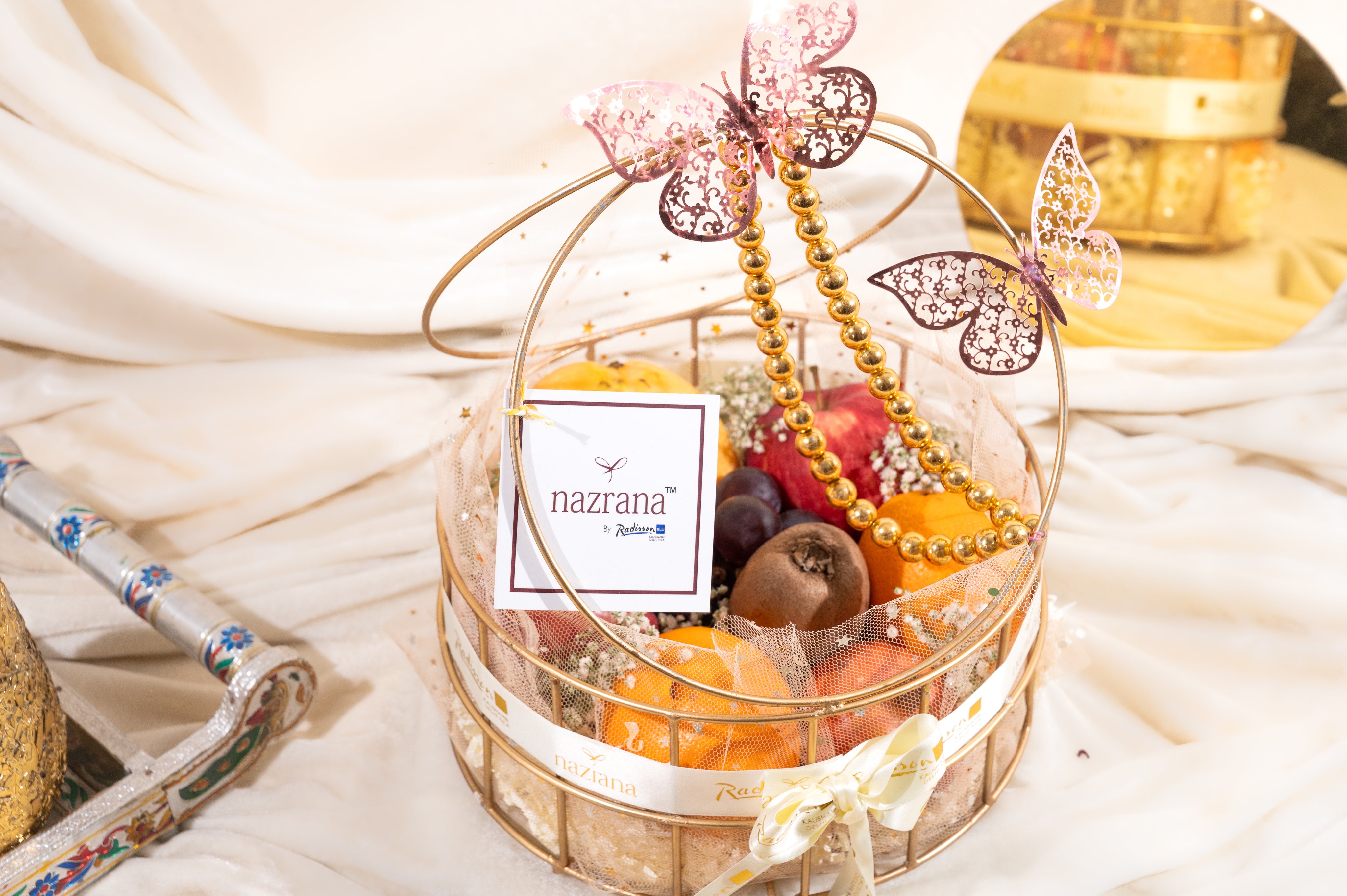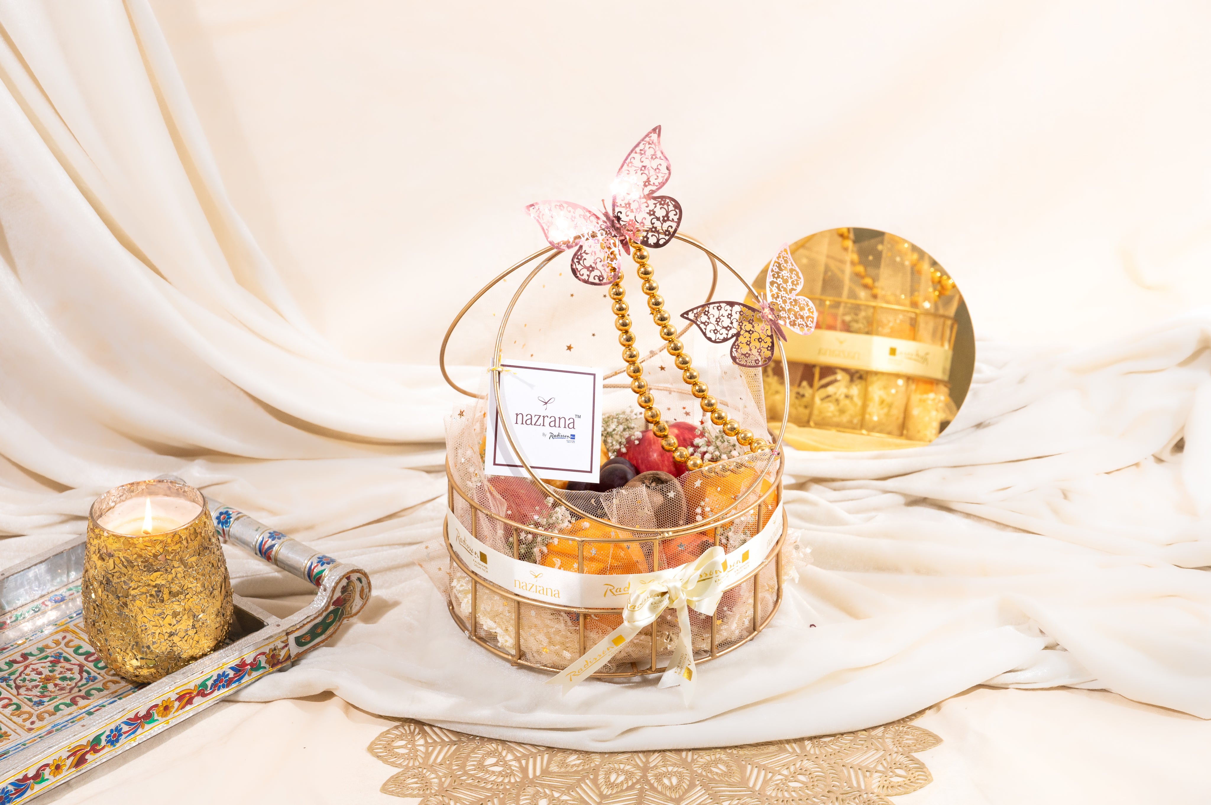 A generous spread of assorted fruits and dry nuts, presented in a gleaming round metal hamper, symbolizing endless blessings and auspiciousness, perfect for marking joyful ceremonies and sacred rituals.